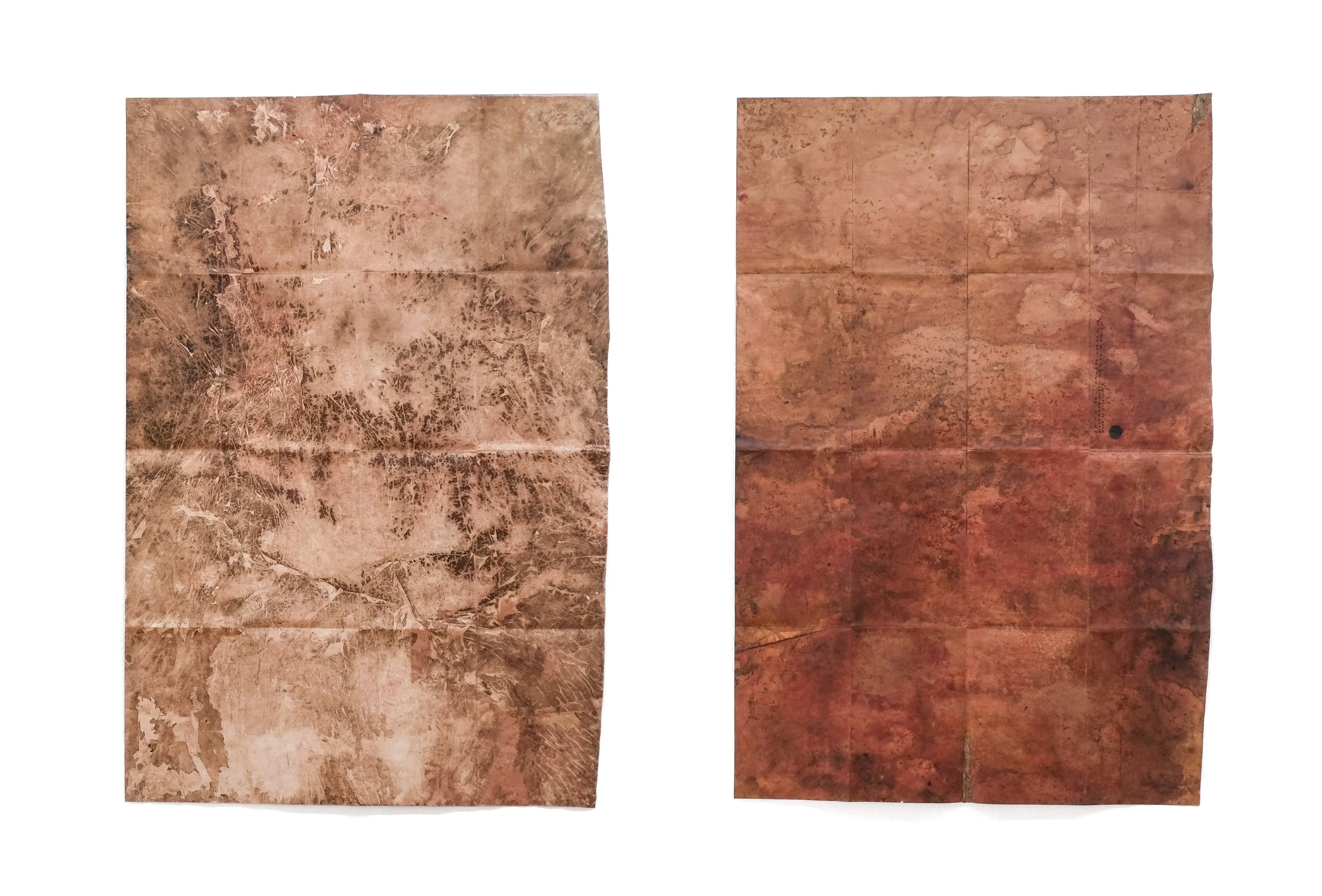 Mapa de Garzón 1/5 (doble cara), 2023, técnica mixta, hierro oxidado y agua del arroyo de Garzón sobre papel, 150×100 cm