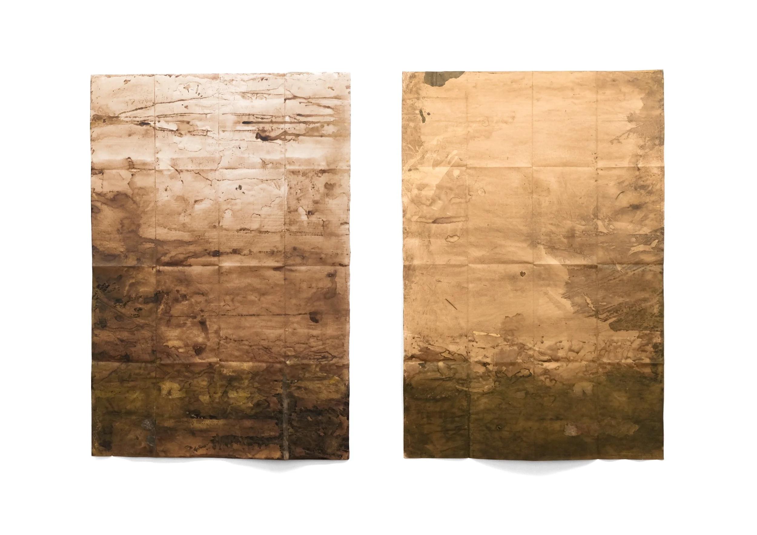 Mapa de Garzón 2/5 (doble cara), 2023, técnica mixta, hierro oxidado y agua del arroyo de Garzón sobre papel, 150×100 cm