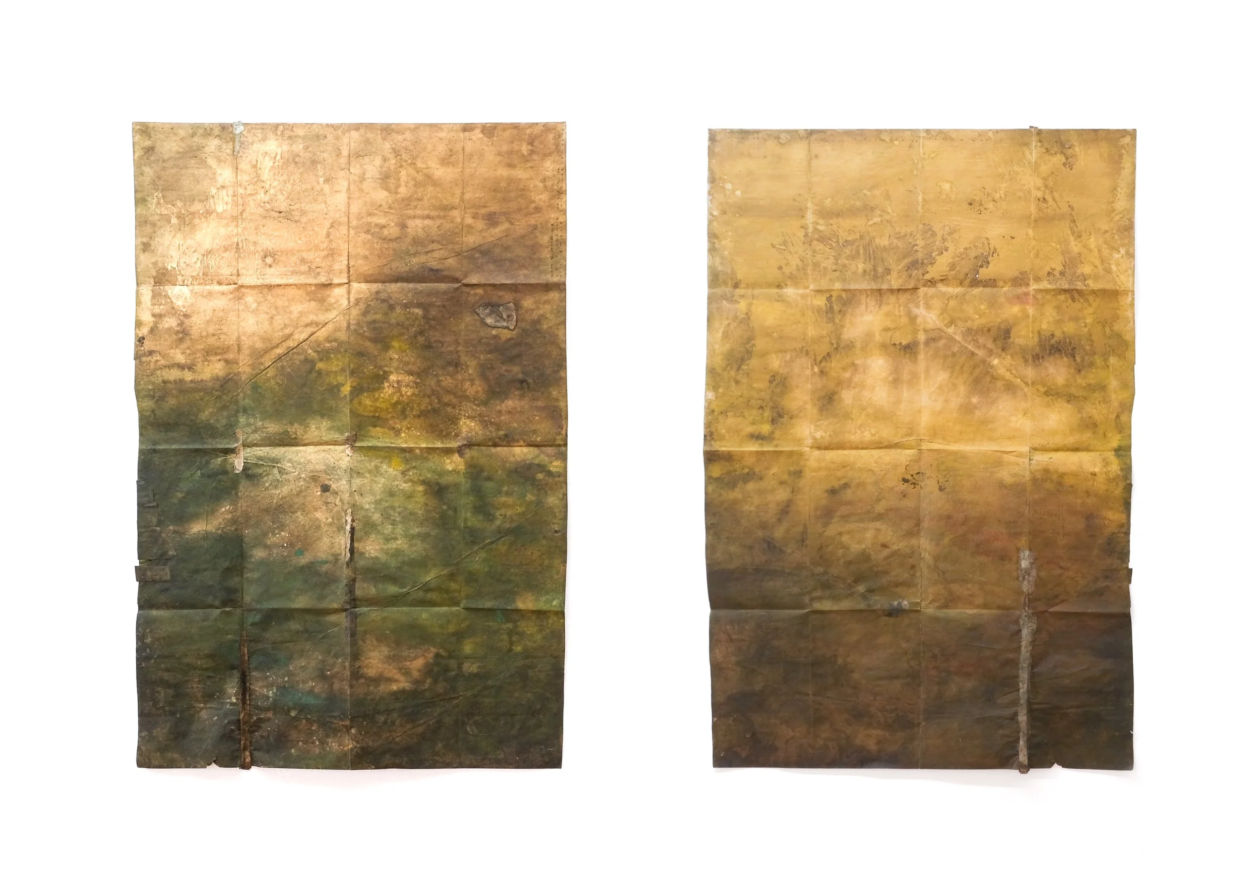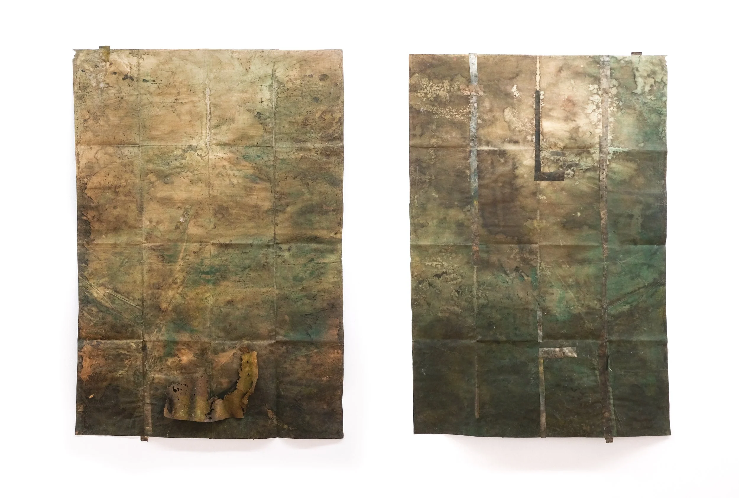 Mapa de Garzón 4/5 (doble cara), 2023, técnica mixta, collage, hierro oxidado y agua del arroyo de Garzón sobre papel, 150×100 cm
