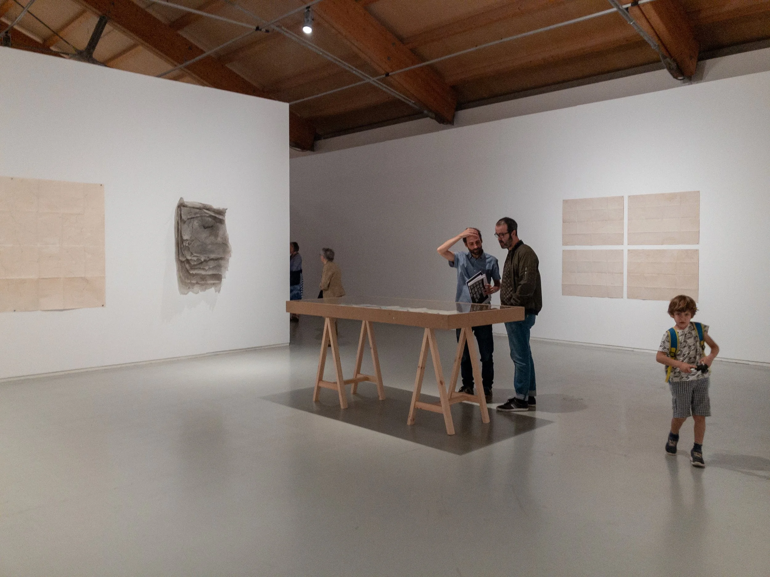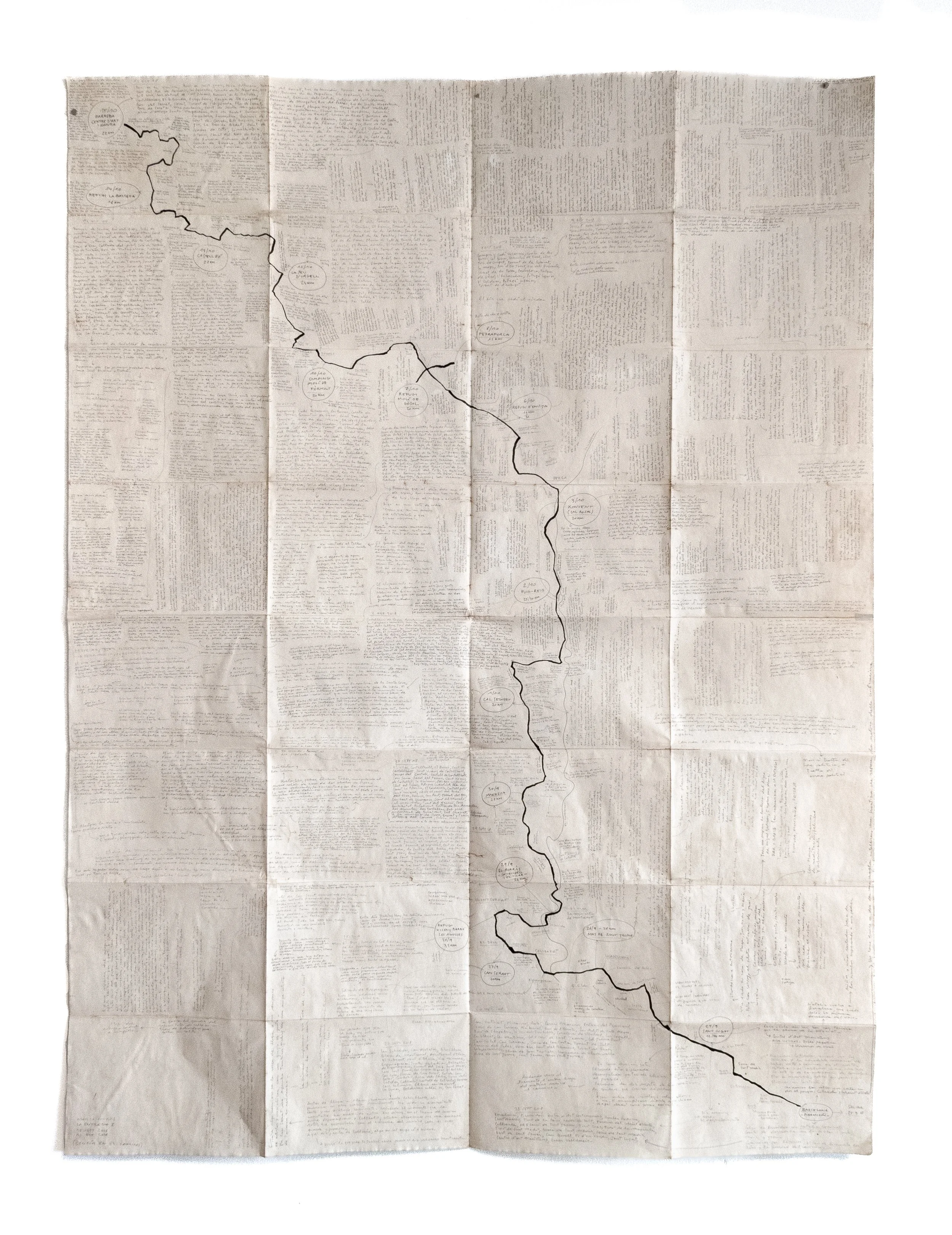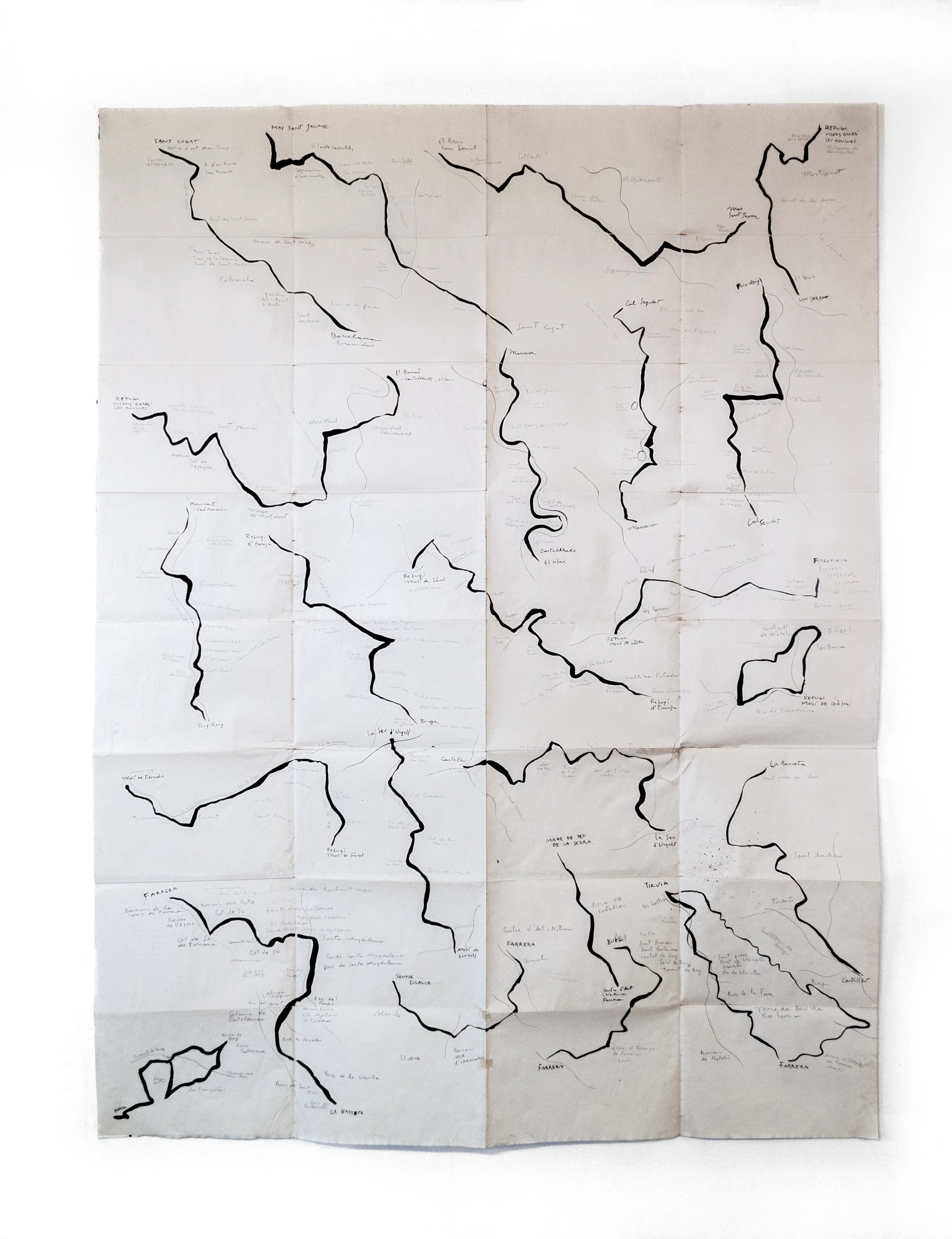 La segunda parte del proyecto tuvo lugar durante la residencia en el Centre d’Art i Natura de Farrera, donde el artista realizó la mayor parte del trabajo basándose en el material recopilado y producido durante el camino. El soporte principal de toda la producción es el papel, preparado en diferentes formatos —entre 50×70 cm y 140×200 cm— y doblado como suelen estar los mapas. Parte del material fue transportado durante la caminata, mapas en blanco utilizados como cuadernos de viaje o de bitácora, mientras que el resto se destinó al trabajo de residencia, profundizando la investigación iniciada durante la travesía.