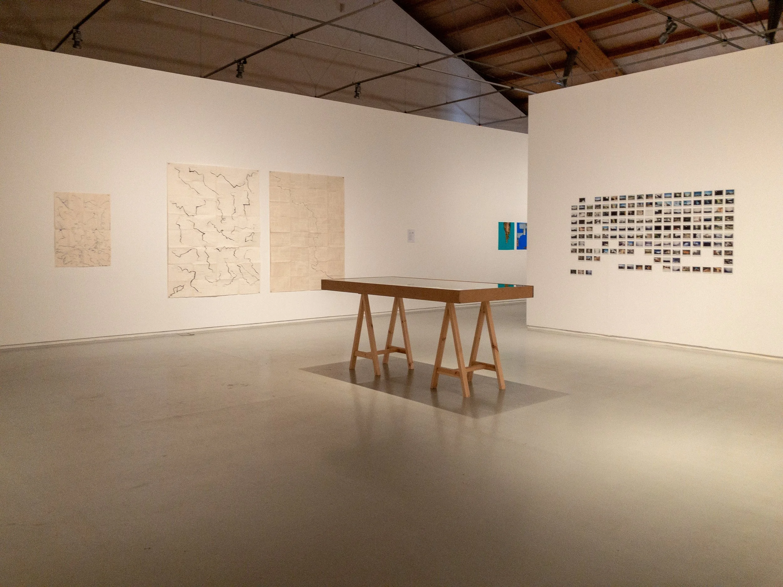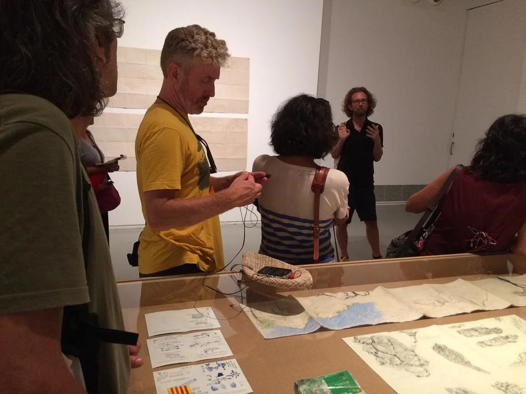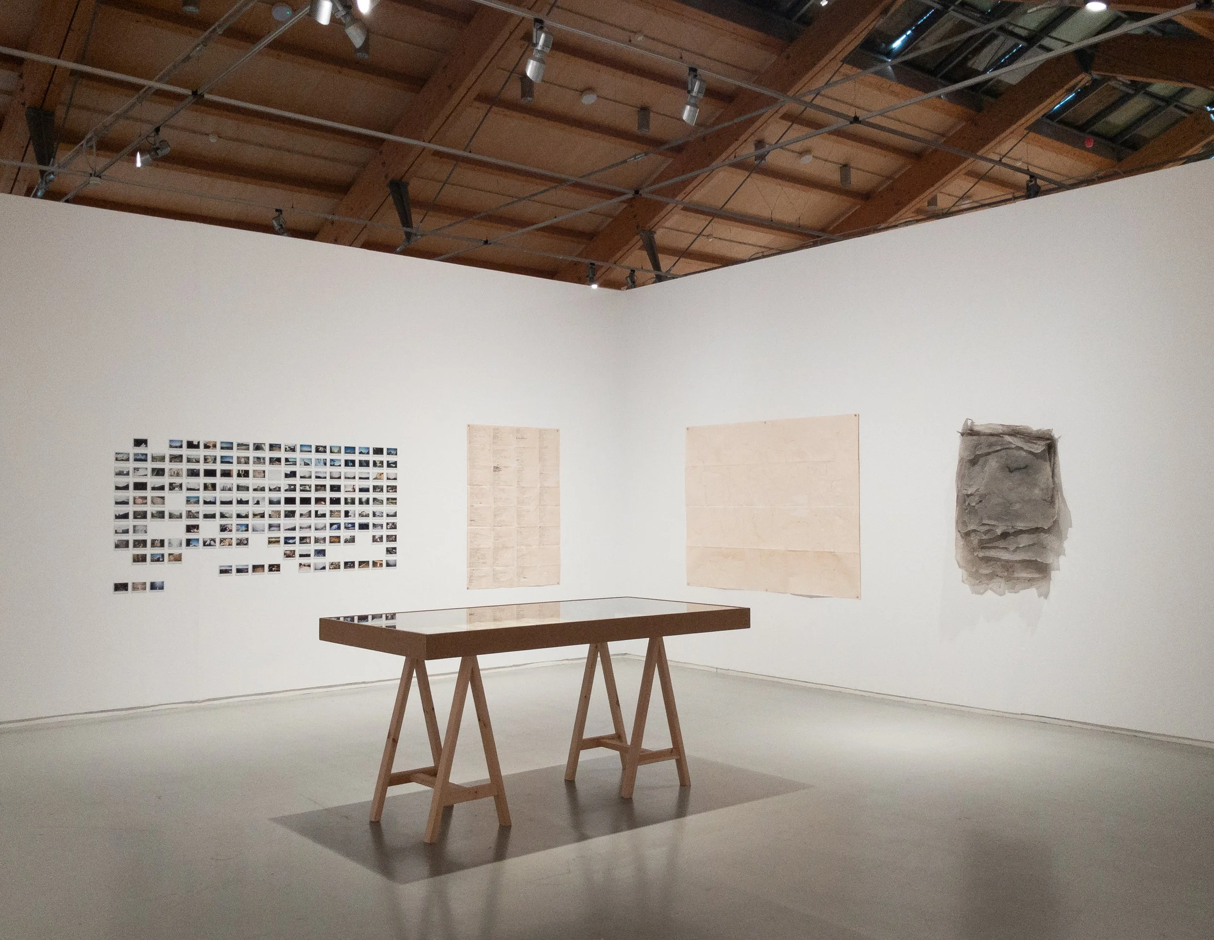 La segunda parte del proyecto tuvo lugar durante la residencia en el Centre d’Art i Natura de Farrera, donde el artista realizó la mayor parte del trabajo basándose en el material recopilado y producido durante el camino. El soporte principal de toda la producción es el papel, preparado en diferentes formatos —entre 50×70 cm y 140×200 cm— y doblado como suelen estar los mapas. Parte del material fue transportado durante la caminata, mapas en blanco utilizados como cuadernos de viaje o de bitácora, mientras que el resto se destinó al trabajo de residencia, profundizando la investigación iniciada durante la travesía.